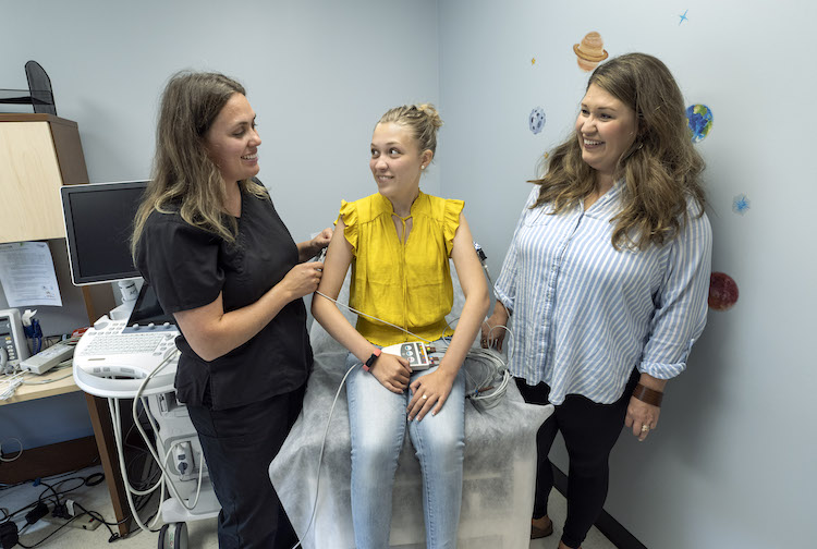 Dee Joyce says her daughter, Rylee, has been experiencing long-lasting symptoms from COVID-19 for more than a year. Rylee is now one of more than 200 kids, teens and young adults around Virginia to have enrolled in the RECOVER project. Pictured left to right: Laura Stevens, RN, clinical research nurse coordinator, Rylee Joyce and Dee Joyce. (VCU Enterprise Marketing and Communications)