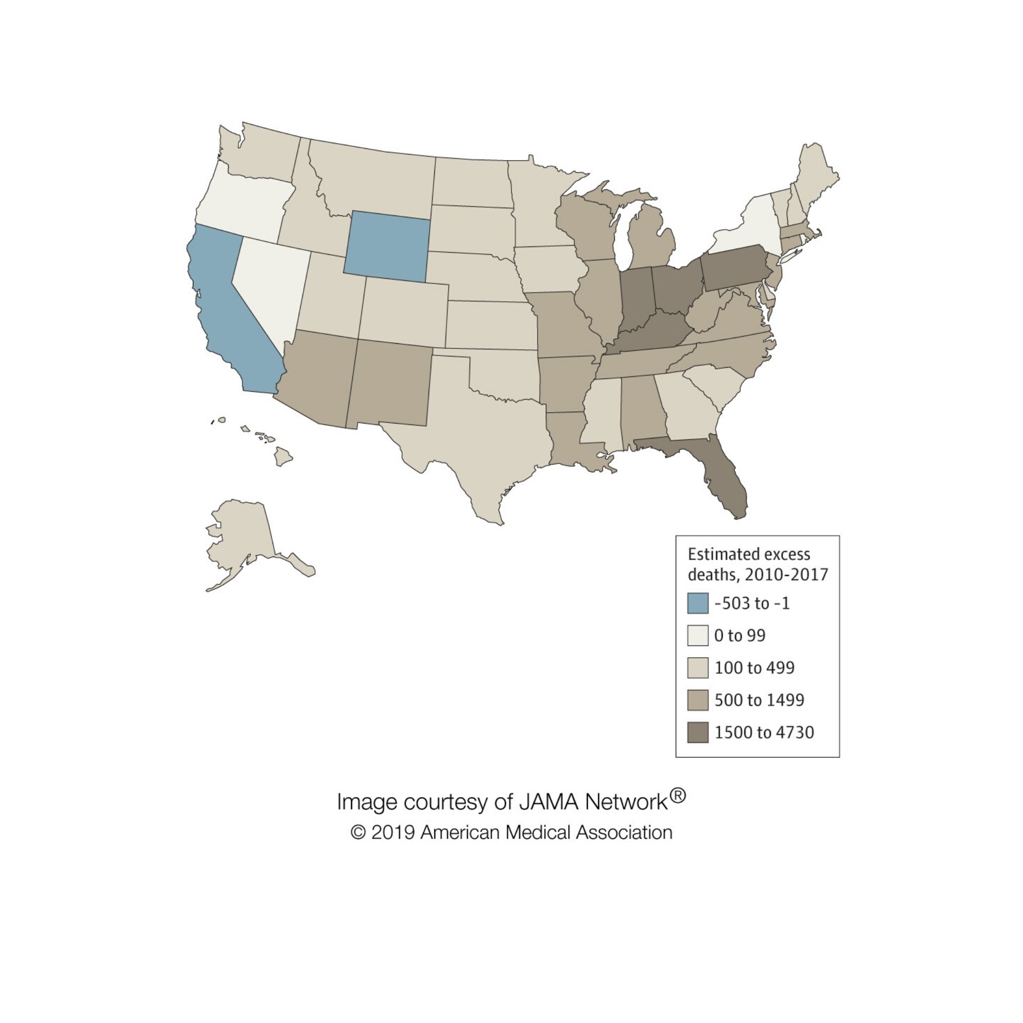 Eight of the 10 states with the largest number of excess deaths for ages 25 to 64 were in the Rust Belt or Appalachia, Woolf said, and the13 Appalachian states accounted for half of excess deaths.